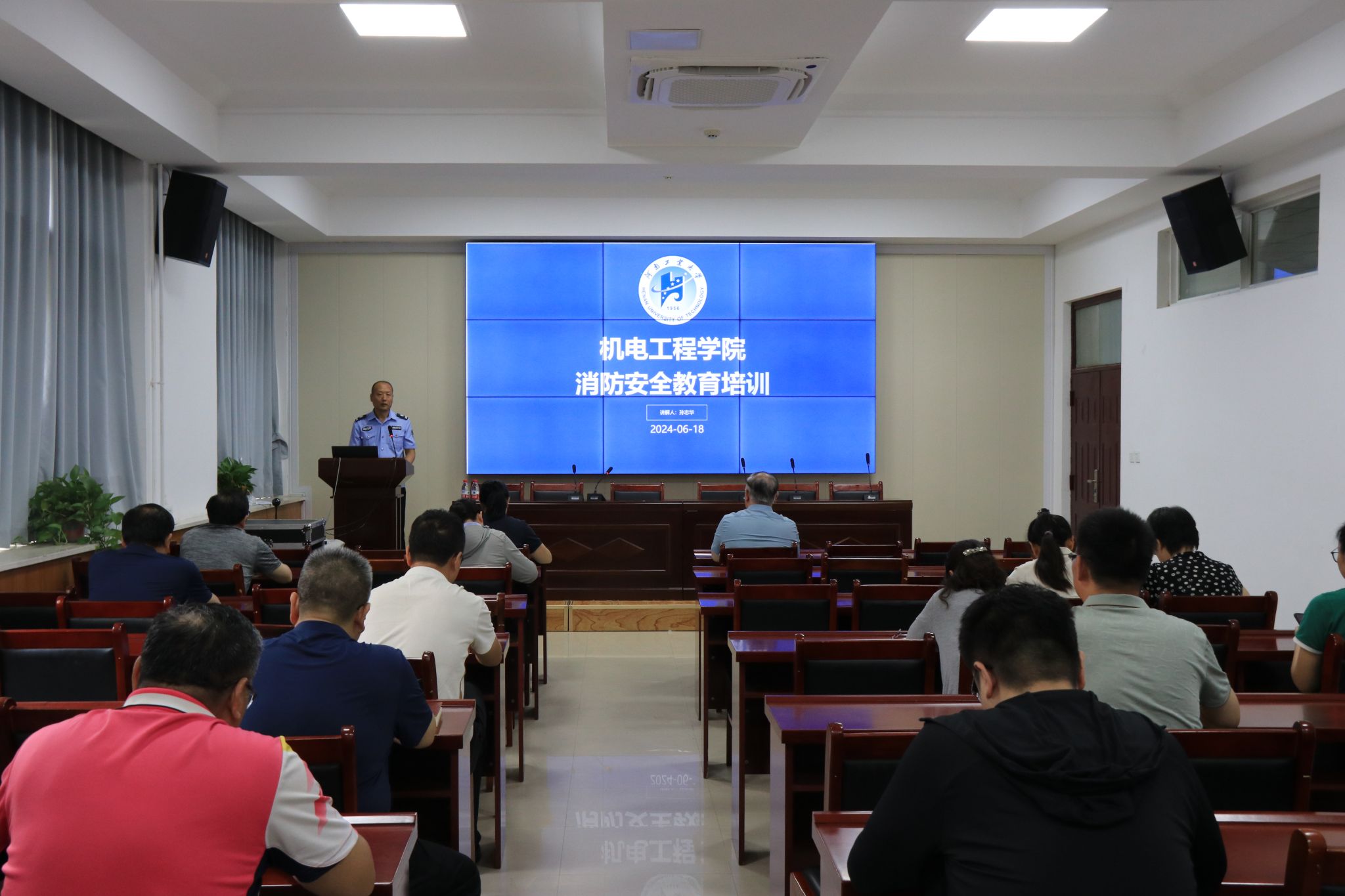 “消防安全教育培训”特邀校保卫处孙志华老师进行宣讲。他结合视频及校园内发生的典型案例,从培训的目的、目前消防安全形势、如何预防火灾、初起火灾处置措施等几个方面生动形象地向老师们普及了消防安全知识,介绍了学院办公楼的应急灯、疏散指示灯、安全出口灯及疏散示意图等。