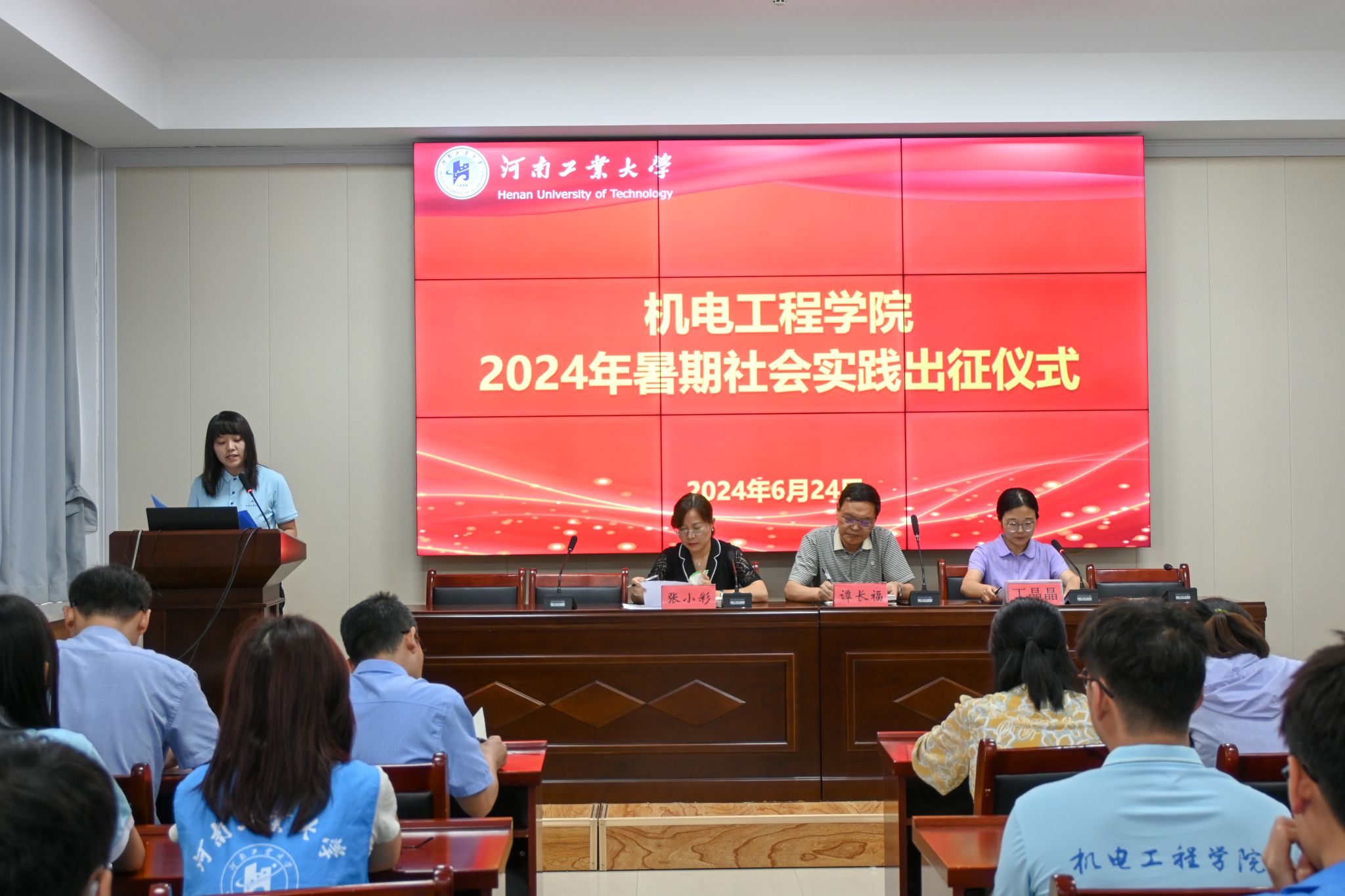 在捷赛厅举行2024年暑期社会实践出征仪式。院党委书记谭长福、副书记张小彩、全体辅导员老师及2024年暑期社会实践全体队员参加了此次会议。会议由院团委副书记丁晶晶主持。