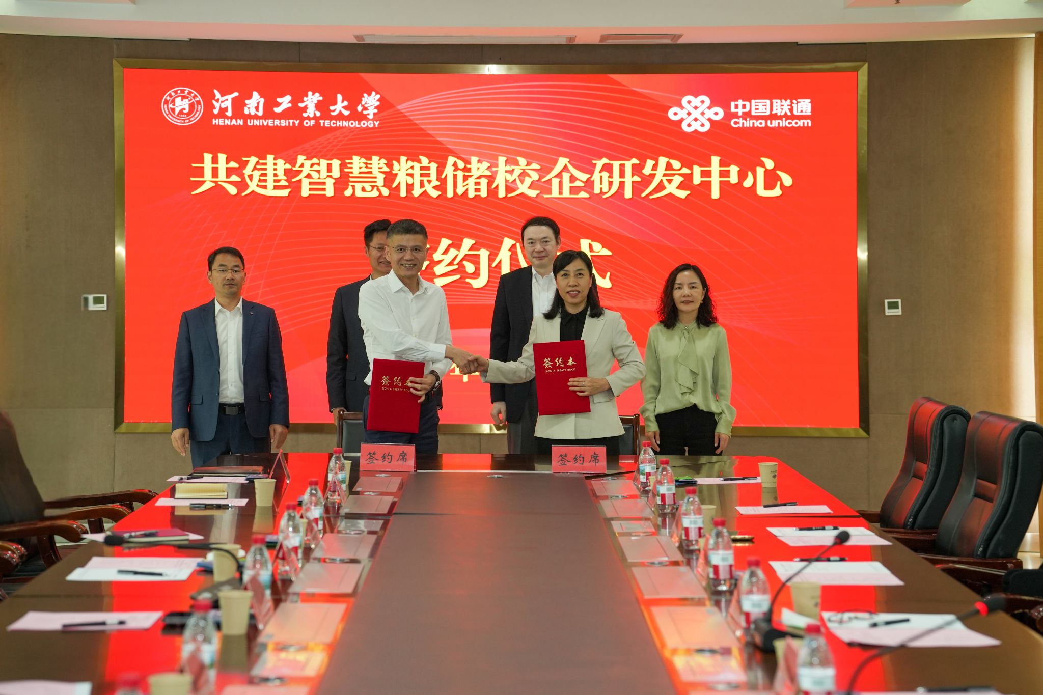 与中国联通郑州市分公司共建“智慧粮储校企研发中心”签约仪式在学术报告中心D203会议室举行。校长吴智深、副校长白艳红,以及校长办公室、科技处、产业技术研究院、信息化办公室、P站