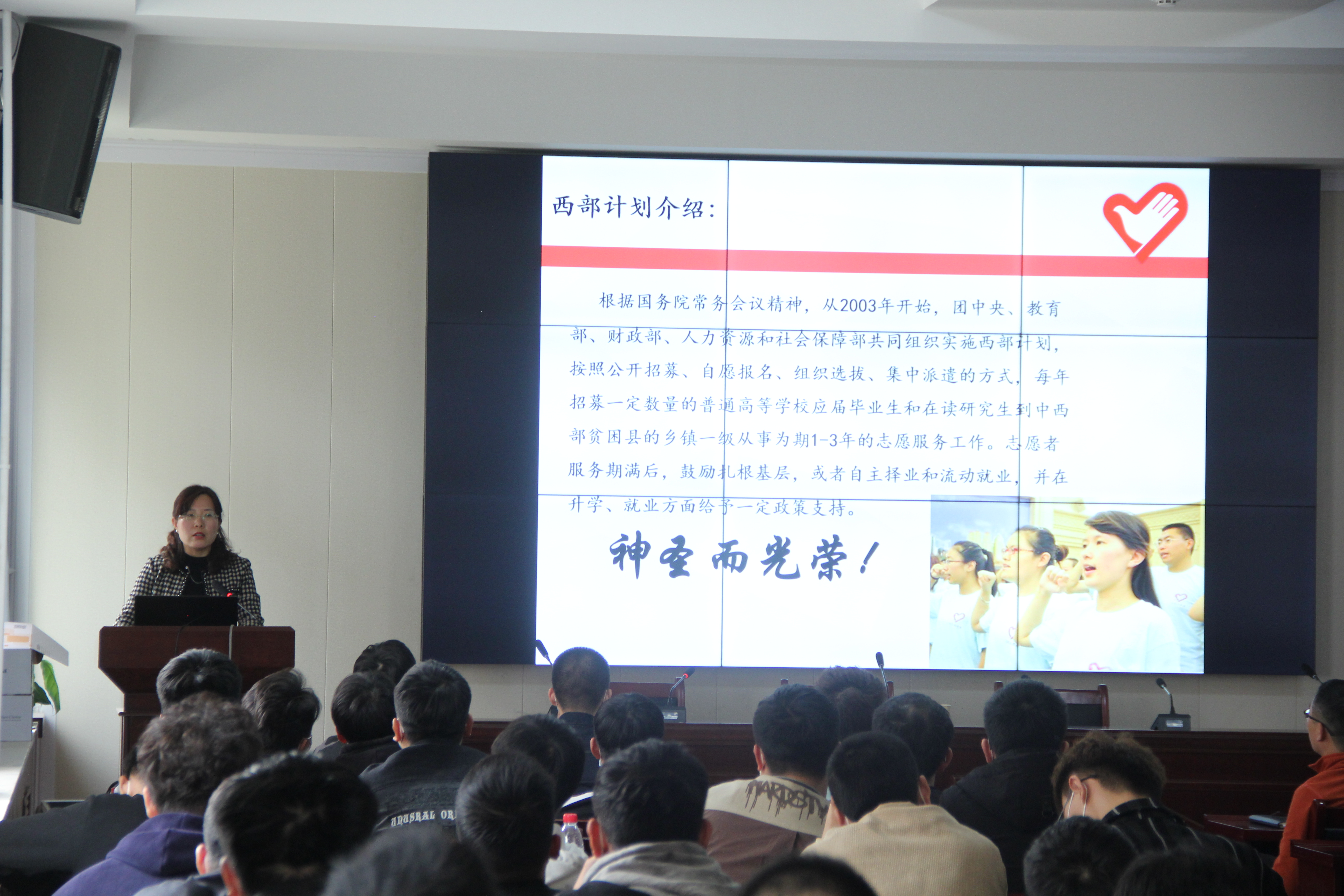 在7224会议室召开就业推进暨西部计划专题宣讲会。学院党委副书记张小彩、学工办副主任刘伟杰以及毕业生全体班长、团支书、寝室长一百余人参加了会议,会议由毕业生辅导员冯晨晨主持。
