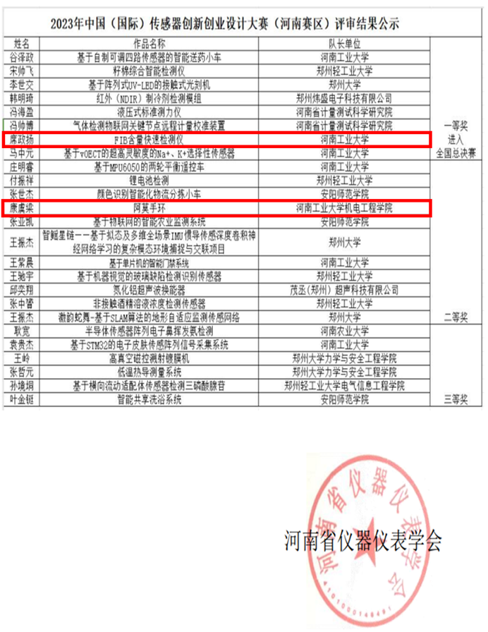 “FIB含量快速检测仪”及“阿莫手环”团队在关炎芳、李友才两位导师带领下分别荣获一等奖和二等奖。其中,“FIB含量快速检测仪”队伍成功晋级国赛。