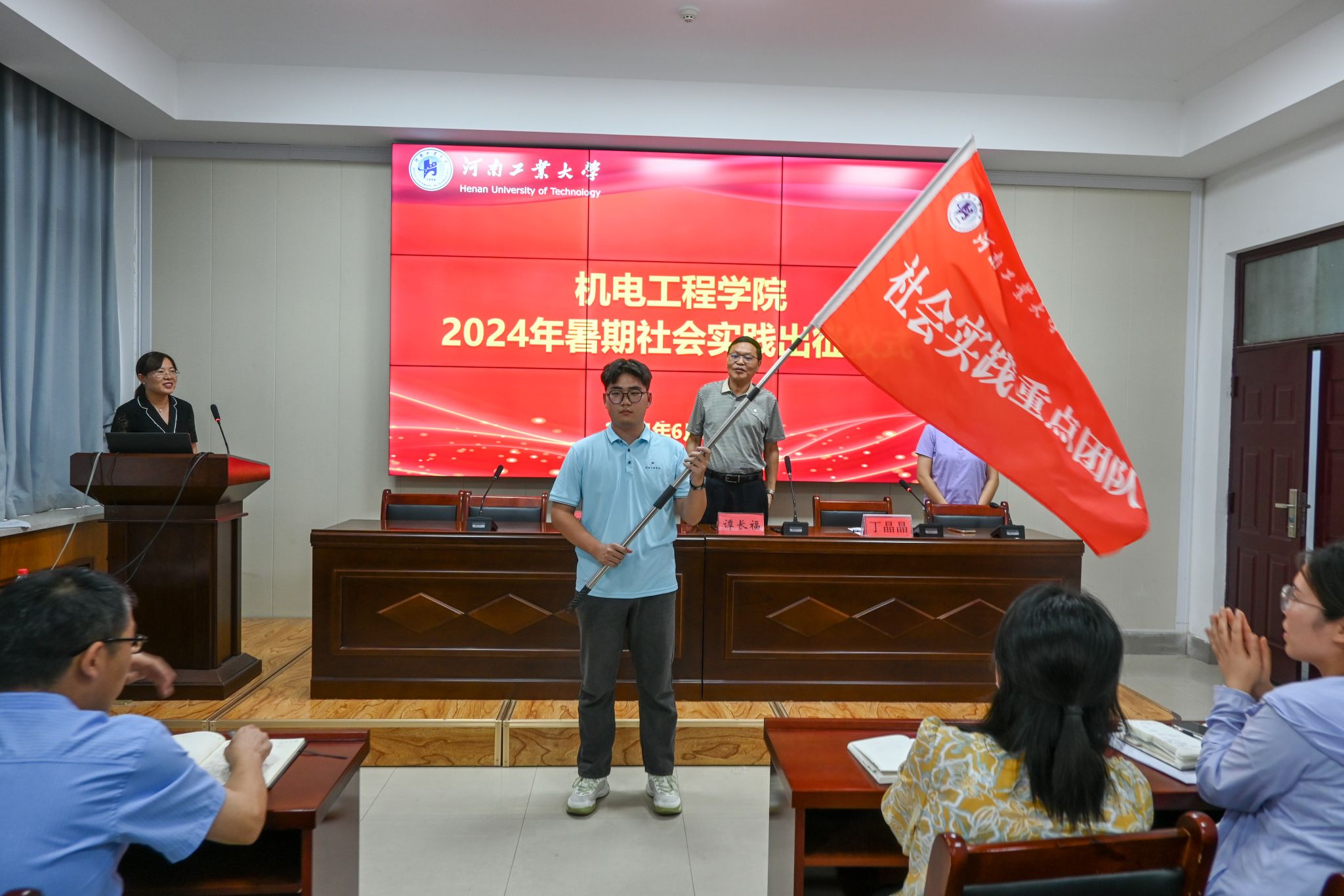 仪式最后,谭长福为学院社会实践重点团队授旗,并宣布P站