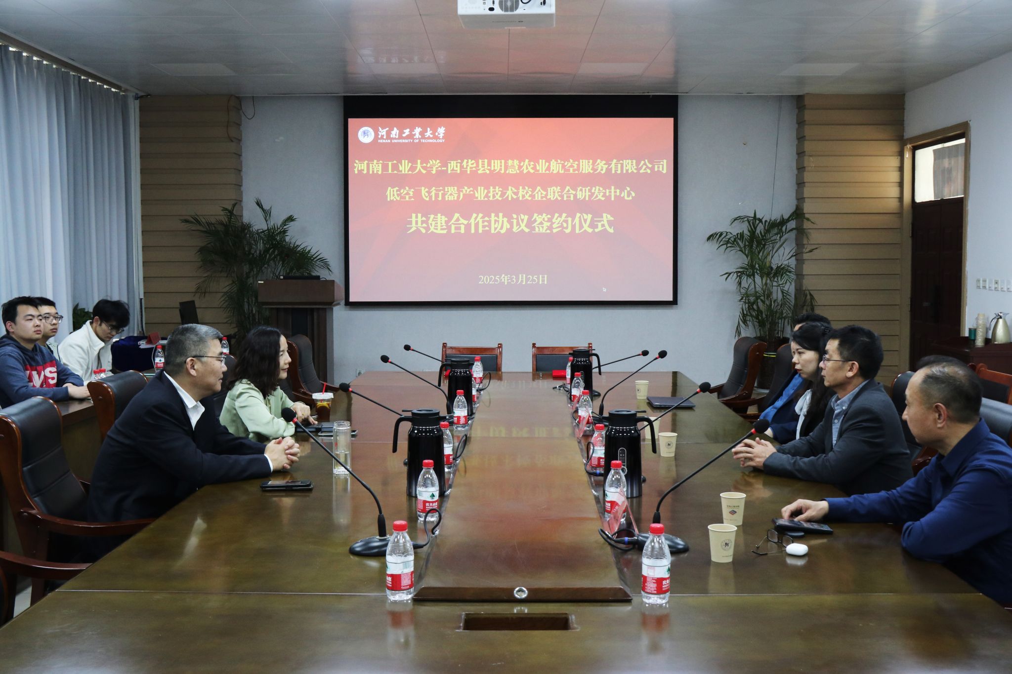 3月25日下午,学院与西华县明慧农业航空服务有限公司共建“低空飞行器产业技术校企联合研发中心”合作协议签约仪式在惟明楼7244会议室举行。院长吴兰、郑州轻工业行业协会秘书长兼P站