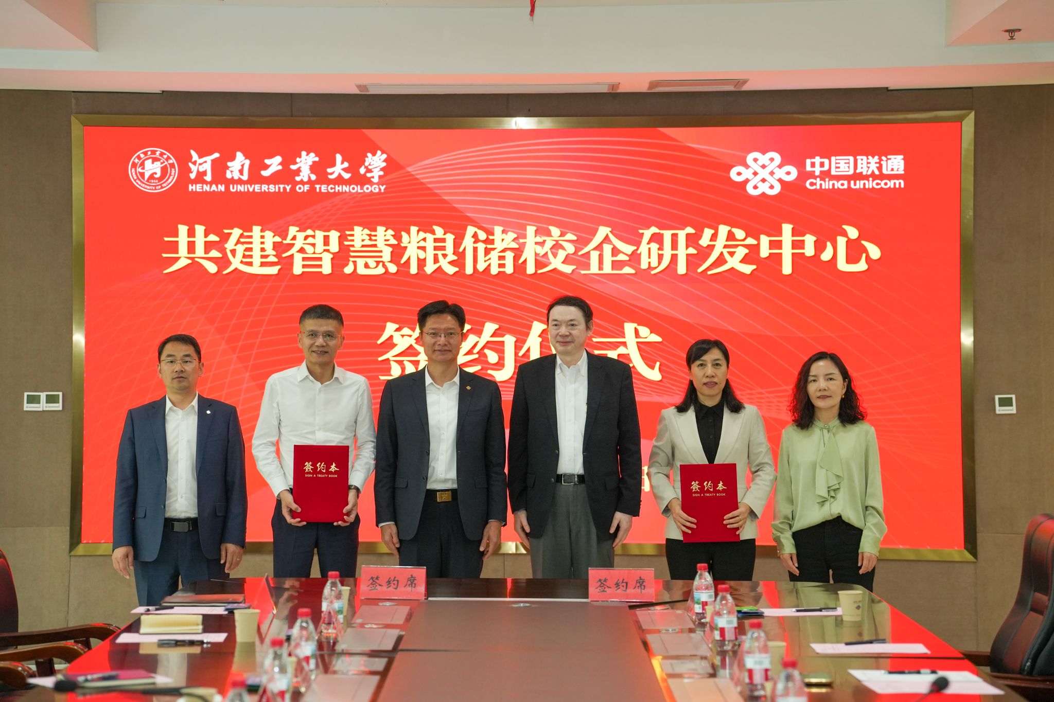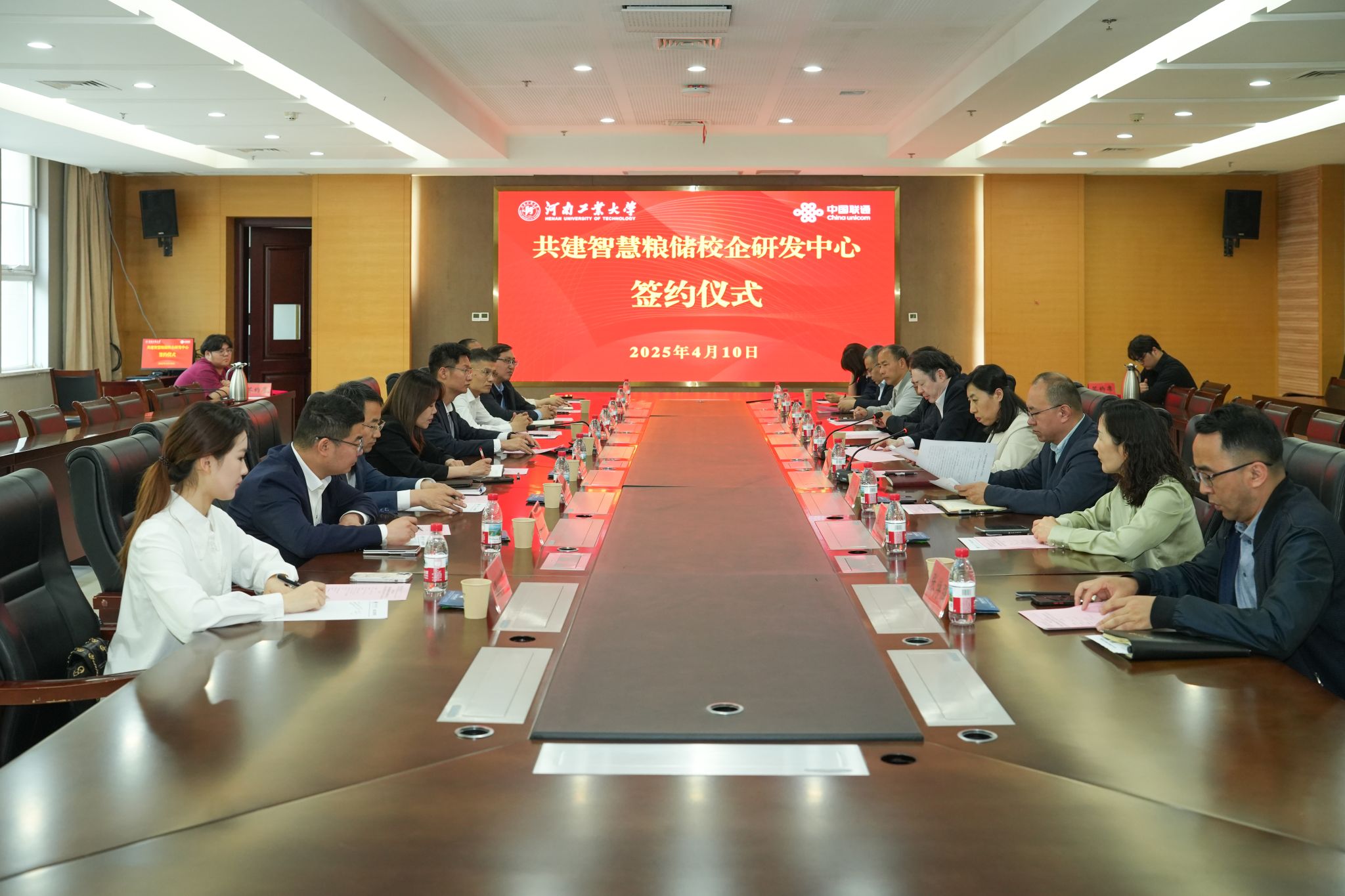 与中国联通郑州市分公司共建“智慧粮储校企研发中心”签约仪式在学术报告中心D203会议室举行。校长吴智深、副校长白艳红,以及校长办公室、科技处、产业技术研究院、信息化办公室、P站