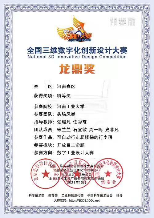 学生宋兰兰、石宜敏、周一鸣和史菲凡同学设计的“可自动行走爬楼梯的行李箱”,构思新颖,大胆创新,能够智能化的控制行李箱上下楼梯和平地运行。而另一件“智能回收服务机器人”作品通过使用“全向轮”结构,打破了传统轮子角度移动困难的问题。在机器人的回收管道与回收仓体的移动连接方面,抛弃了传统的电机移动仓体技术,创新“电磁定位连接管道”技术,利用电磁的吸引使管道定位移动,节能环保,时效更高。目前,该作品正在申请新型专利一件。