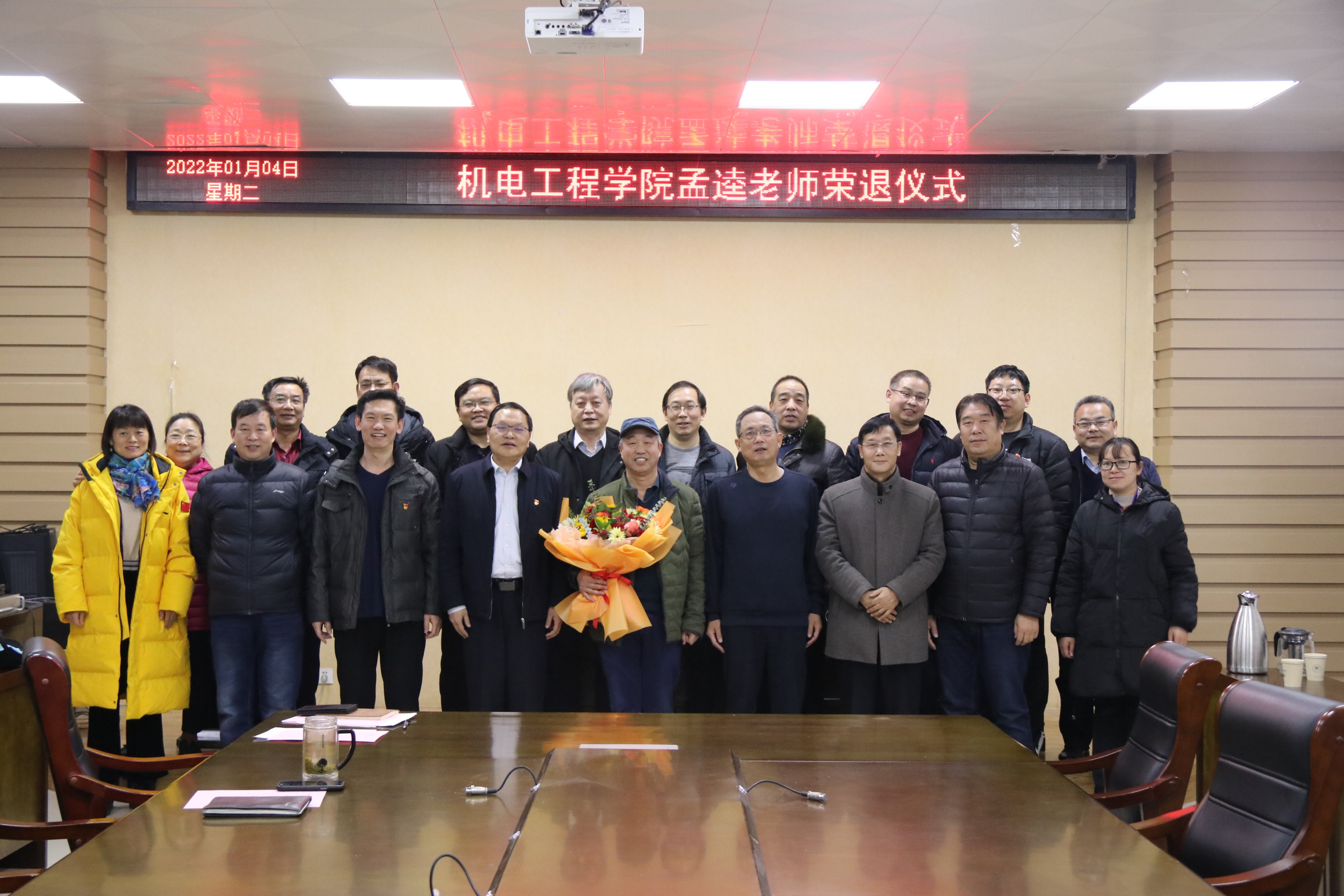 在7244会议室举办孟逵教师荣退仪式,学院党委书记谭长福、院长惠延波和领导班子、各系室主任及教师代表参加,仪式由学院副院长曹毅主持。