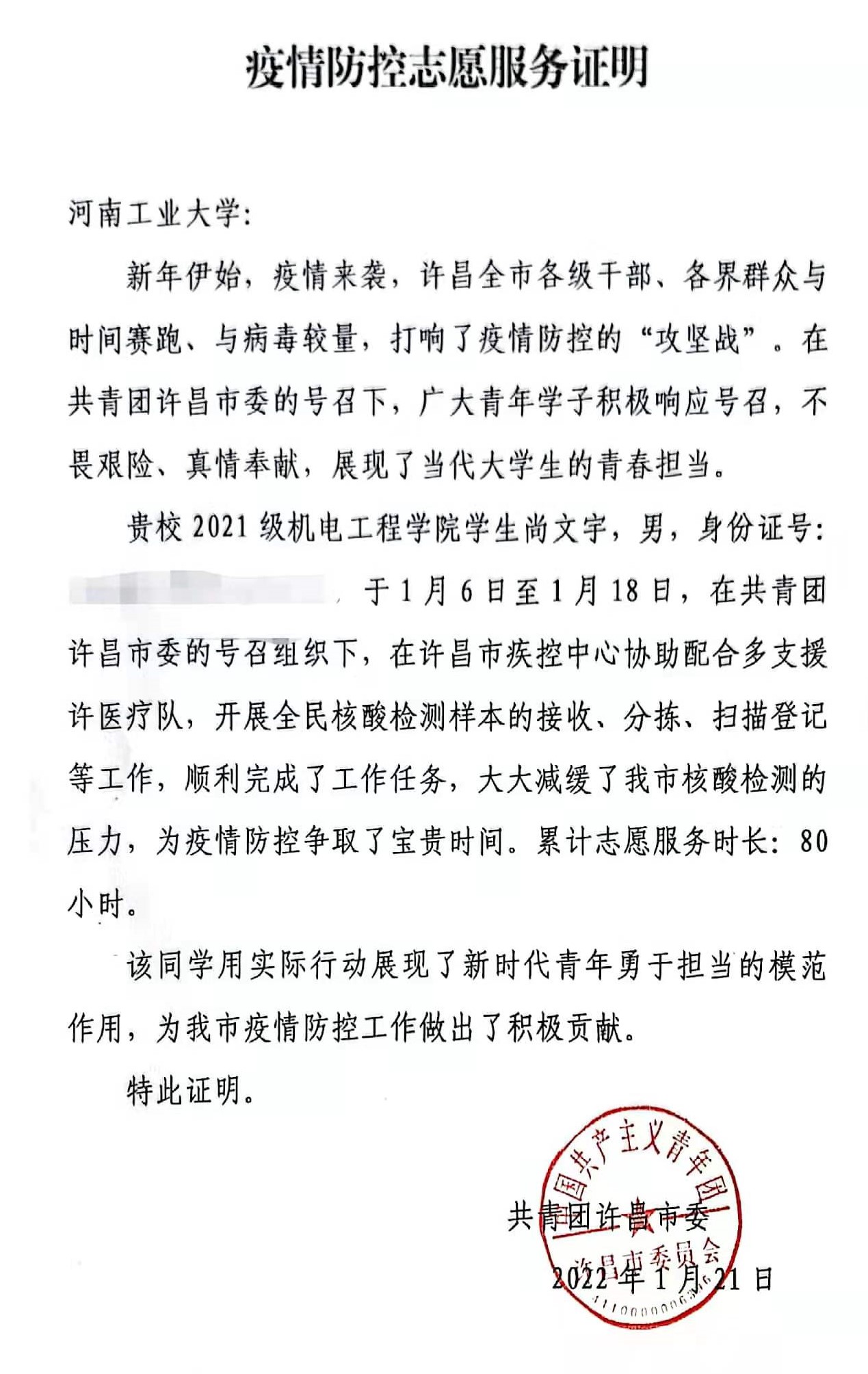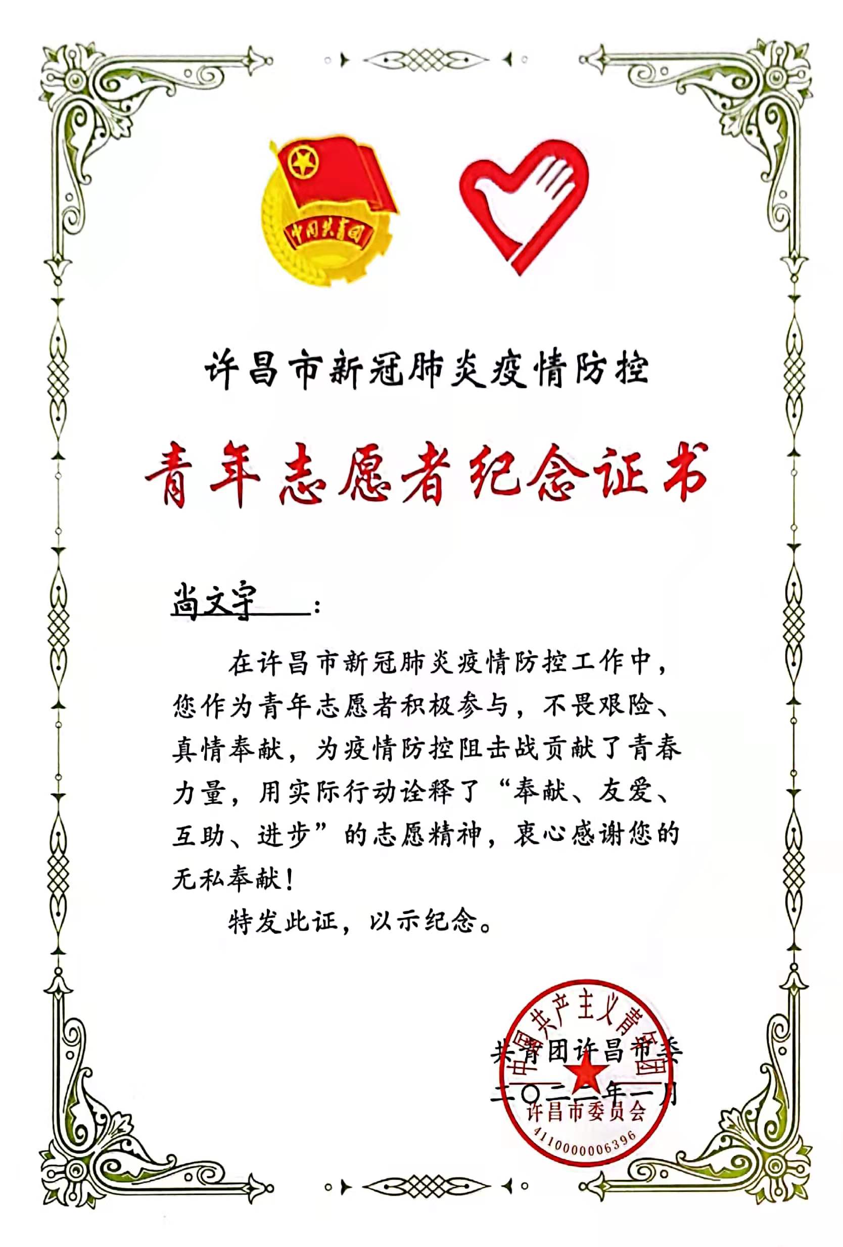 近日,我校收到共青团许昌市委、许昌市疾控中心、许昌市东城区新型冠状病毒感染的肺炎疫情防控指挥部等单位发来的感谢信和疫情防控志愿服务证明,对P站