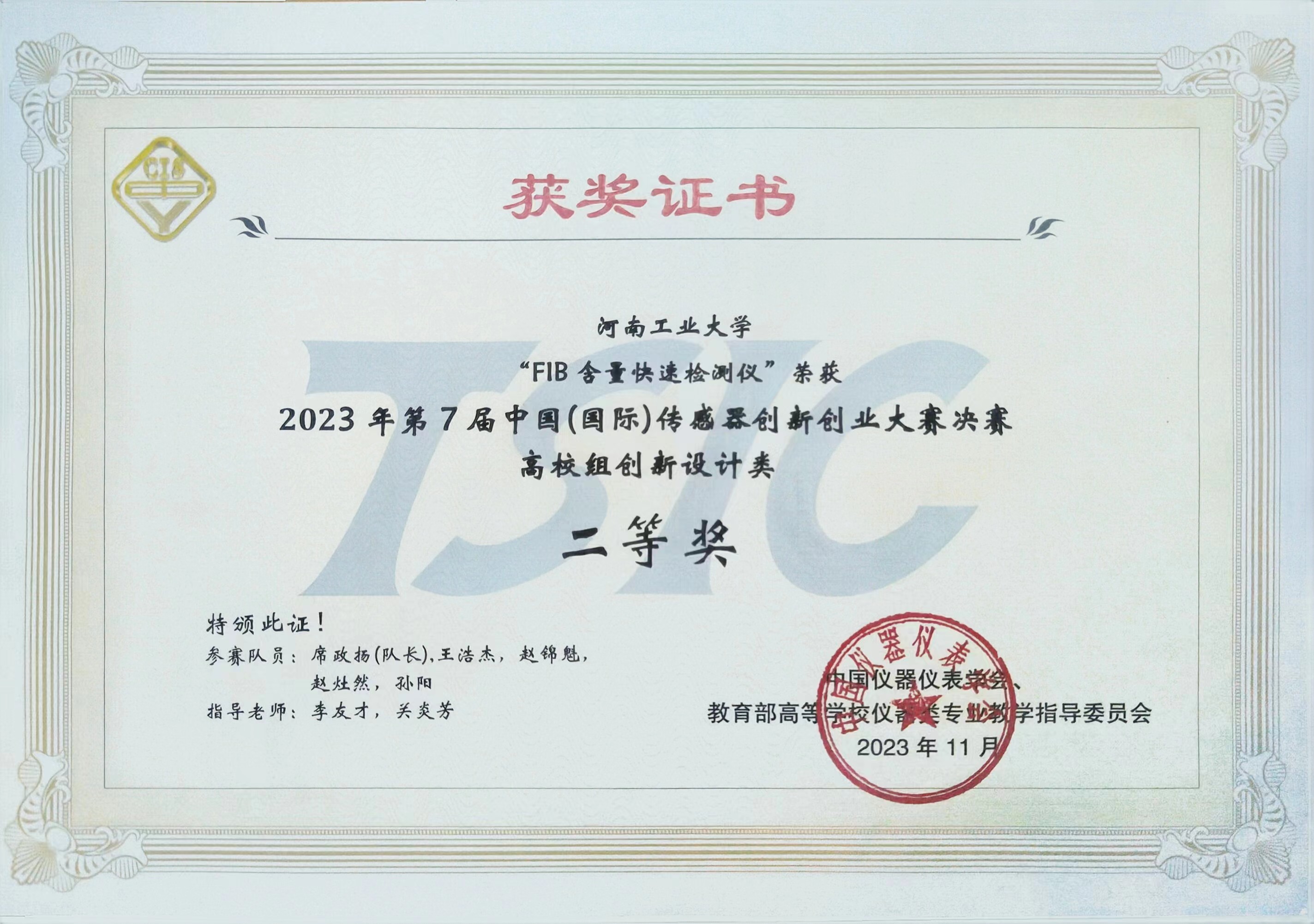 机械设计制造及其自动化专业席政扬、王浩杰、赵锦魁、赵灶然和孙阳五名同学组成的“FIB含量快速检测仪”团队在关炎芳和李有才两位导师的带领下,经过激烈角逐,从全国97个决赛队伍中脱颖而出,荣获高校组创新设计类国赛二等奖。