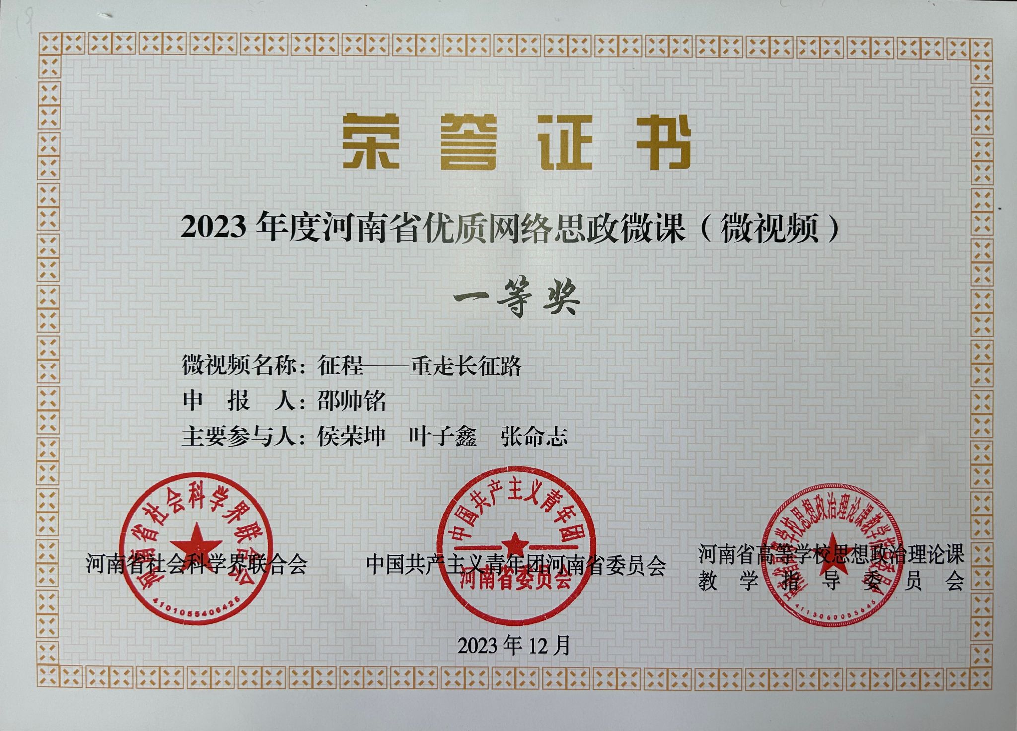 近日,河南省社会科学界联合会公布了2023年度河南省优质网络思政微课(微视频)获奖名单。在此活动中,由P站 张小彩、丁晶晶老师指导,邵帅铭、侯荣坤、叶子鑫、张命志同学参与创作的《征程——重走长征路》作品荣获省优质网络微视频一等奖。